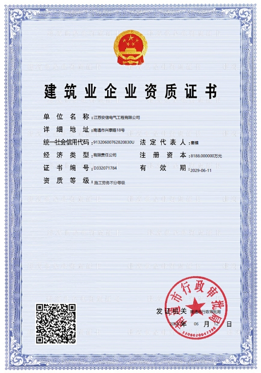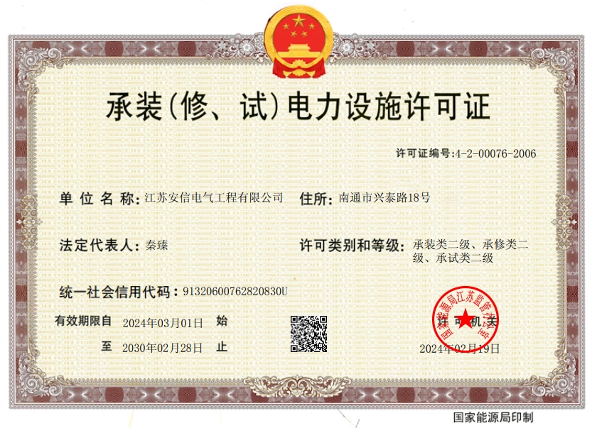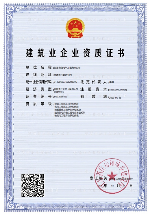 承装二级、承修二级、承试二级,电力工程施工总承包二级,输变电工程专业承包二级,建筑工程施工总承包二级,建筑机电安装专业承包二级,地基基础专业承包二级资质