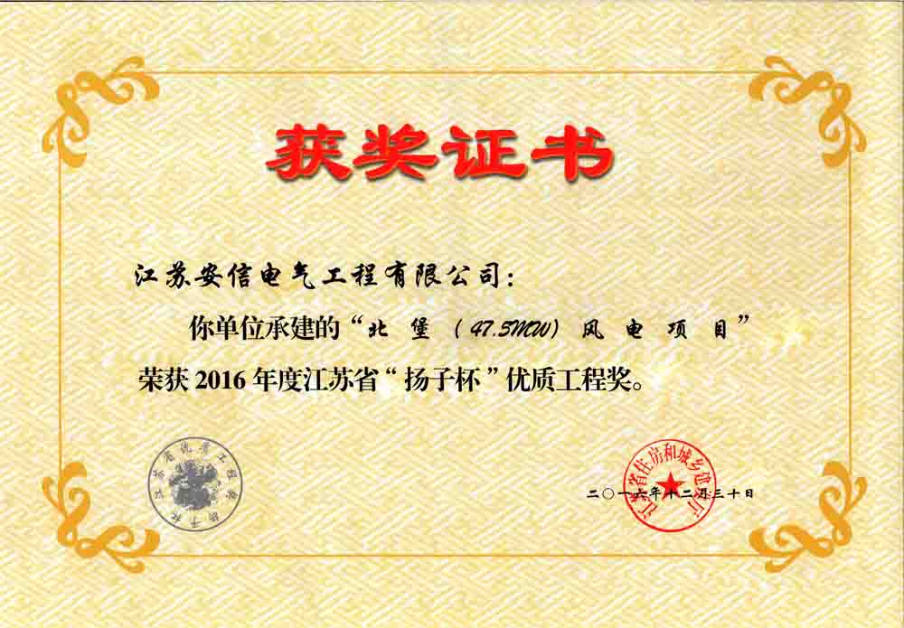 近期,江苏省住建厅公布2016年度江苏省优质工程奖“扬子杯”名单,我公司北堡(47.5MW)风电项目荣获安装专业项目优质工程奖。