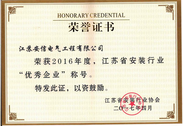 2017年4月,我公司获江苏省安装行业协会颁发的——2016年度江苏省安装行业“优秀企业”称号。