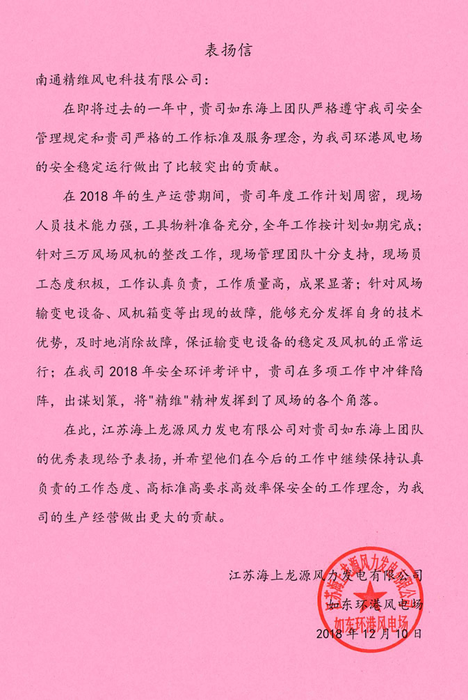 如东海上风场致精维公司的表扬信