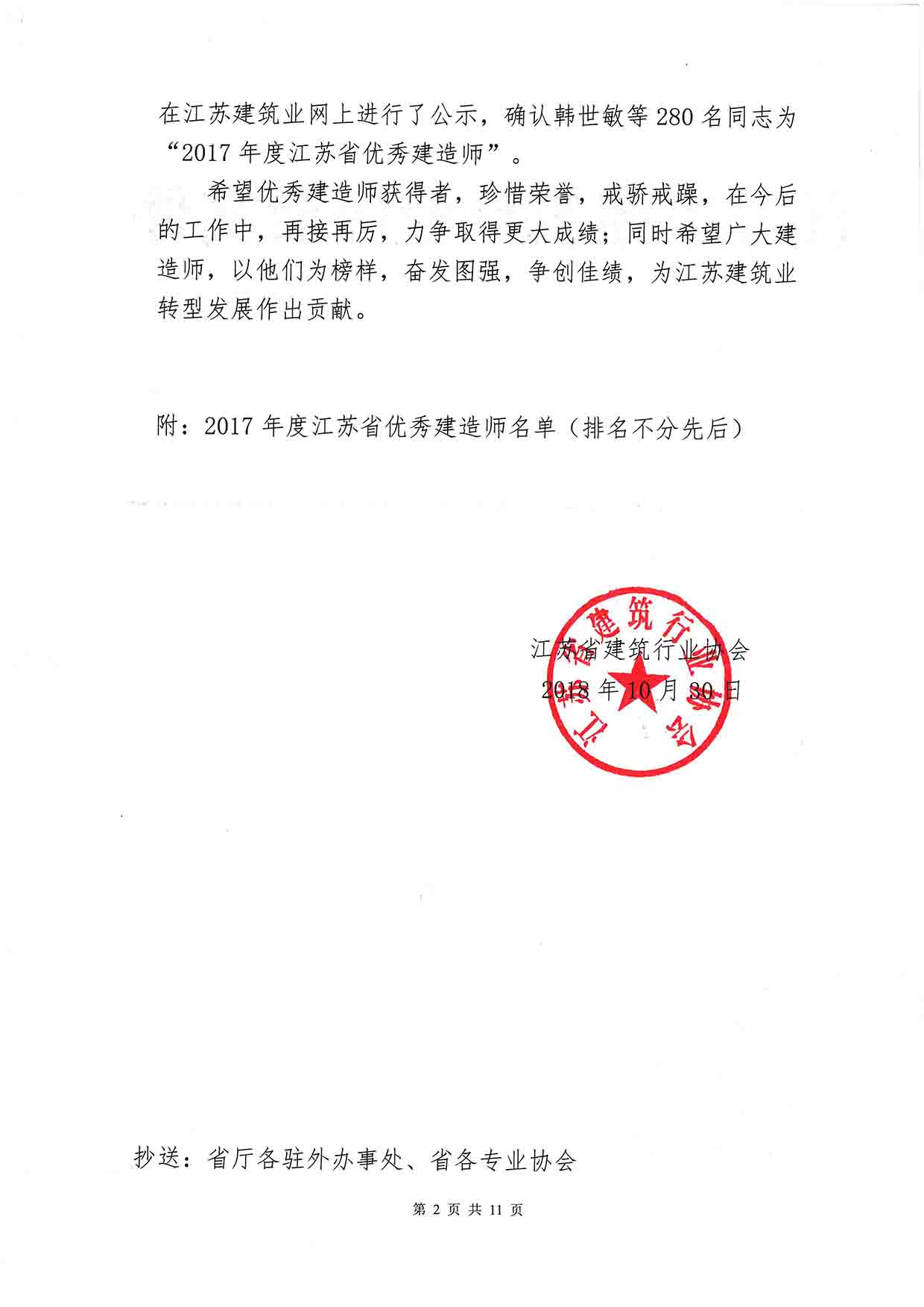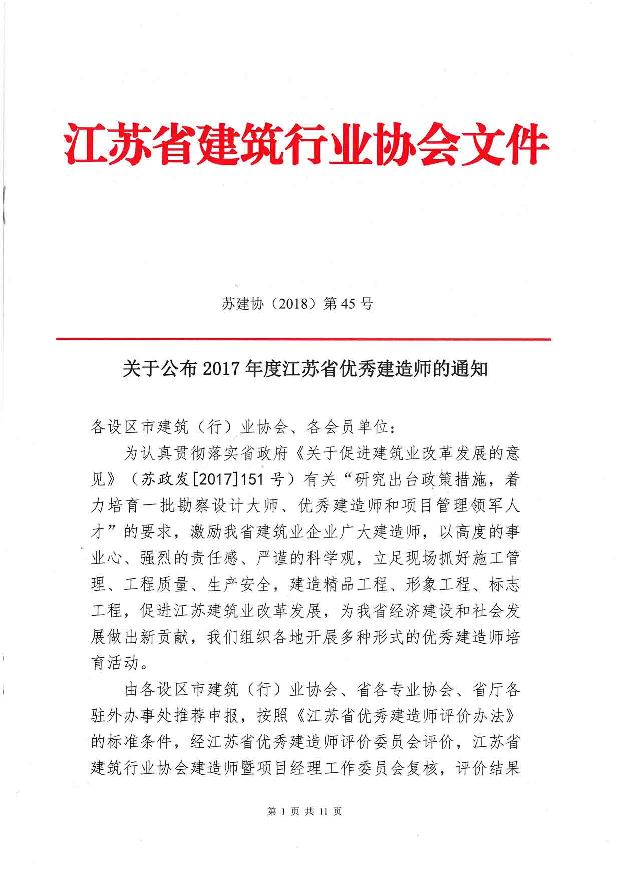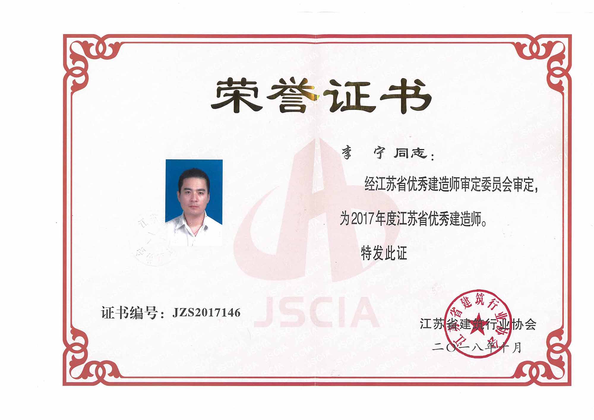 0一八年十月,我公司优秀员工李宁同志喜获江苏省建筑行业协会颁发的“2017年度江苏省优秀建造师”称号